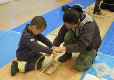 発掘調査の手順や意味について学んだあと、竪穴住居跡の模型を使って、