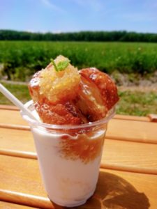 トッピングのジャムやソースは、旬の果物などを使用した自家製です。常時、3種類は用意されているそうですよ。この時は、「あーもんどきゃらめる」、「みんと&れんにゅう」、「ゆず&れんにゅう」、「れんにゅう」がありました。