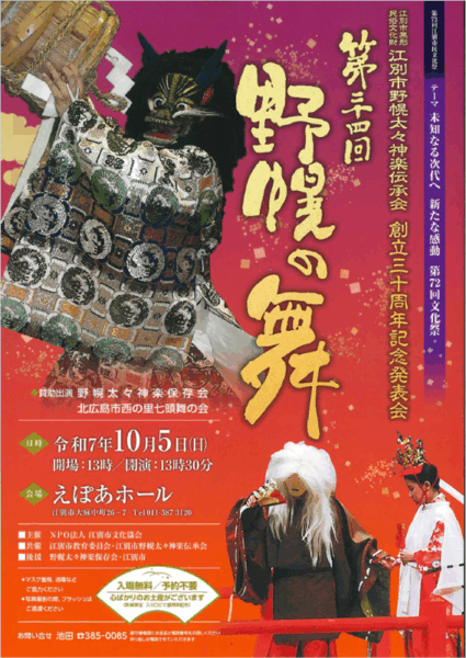 江別市無形民俗文化財 江別市野幌太々神楽伝承会による創立30周年記念発表会です。