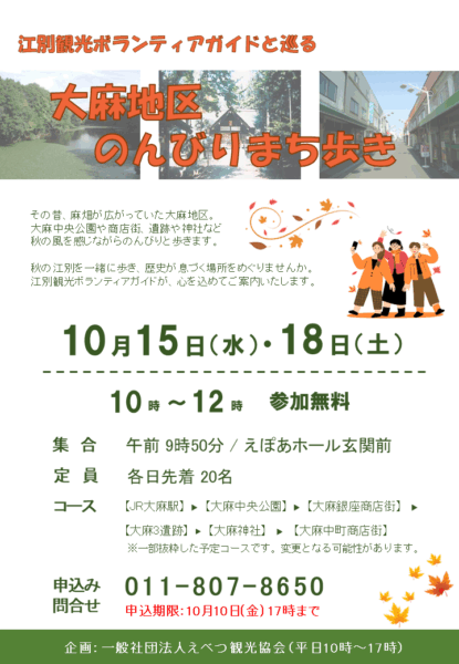 備考 | 【申込】電話(011-807-8650)にて参加申込受付中 申込期限:10月10日(金)17:00まで 【定員】各日先着20名 【コース】JR大麻駅▶大麻中央公園▶大麻銀座商店街▶大麻3遺跡▶大麻神社▶大麻中町商店街 ※一部抜粋した予定コースです。変更となる可能性があります。 |