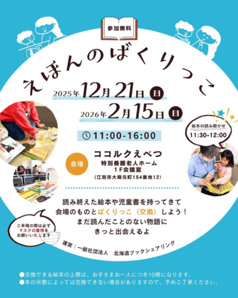 読み終えた絵本や児童書を持ってきて会場の絵本と「ばくりっこ(交換)」できるイベントです。