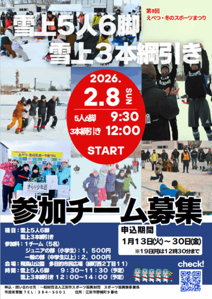| 備考 | 競技「雪上5人6脚」「雪上3本綱引き」は、事前の申込が必要です。 (チラシもご参照ください。) 【申込受付期間】2026/1/13~1/30 19日は12:30まで 【申込方法】 所定の用紙に必要事項を記入の上、参加料を添えて市民体育館へ直接お申し込みください。 (用紙は、スポーツ振興財団HPまたは市内4体育館で配布) ※各部門先着12チームとなります。 ※ジュニアの部は、当日引率者が必要となります。 詳しくは、スポーツ振興財団HPをご覧ください。 |