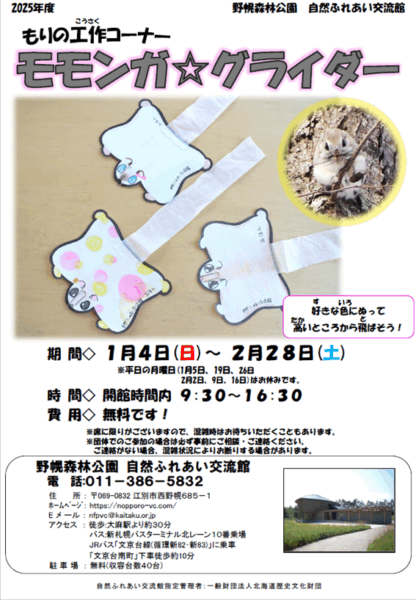 | お問い合わせ | 野幌森林公園 自然ふれあい交流館 TEL 011-386-5832 |