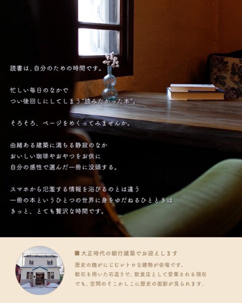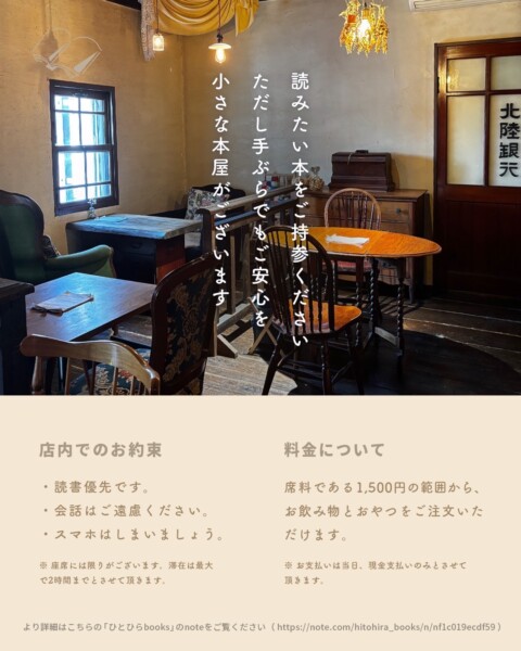 | 料金 | 読書のための席料 税込1,500円 (ドリンク・おやつ付き/120分) |